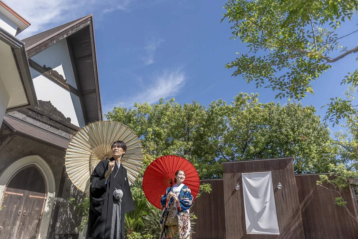 創寫舘大府スタジオに隣接する結婚式場「マキシマニス」を利用したロケーション撮影が利用可能。一般的な写真館とは違うバリエーション豊かな仕上がりに。