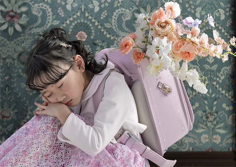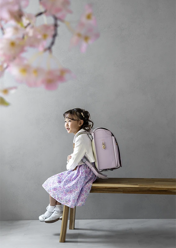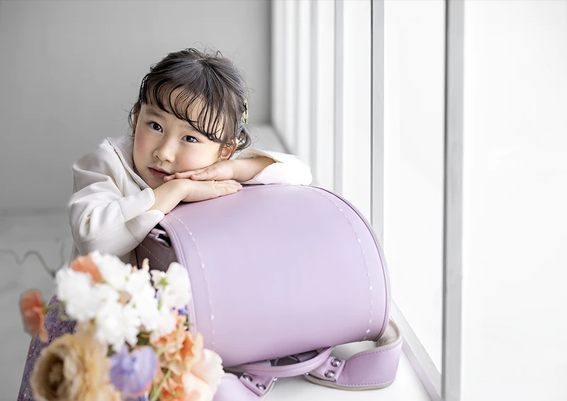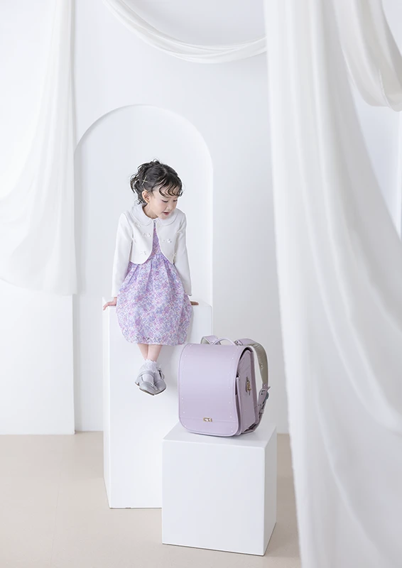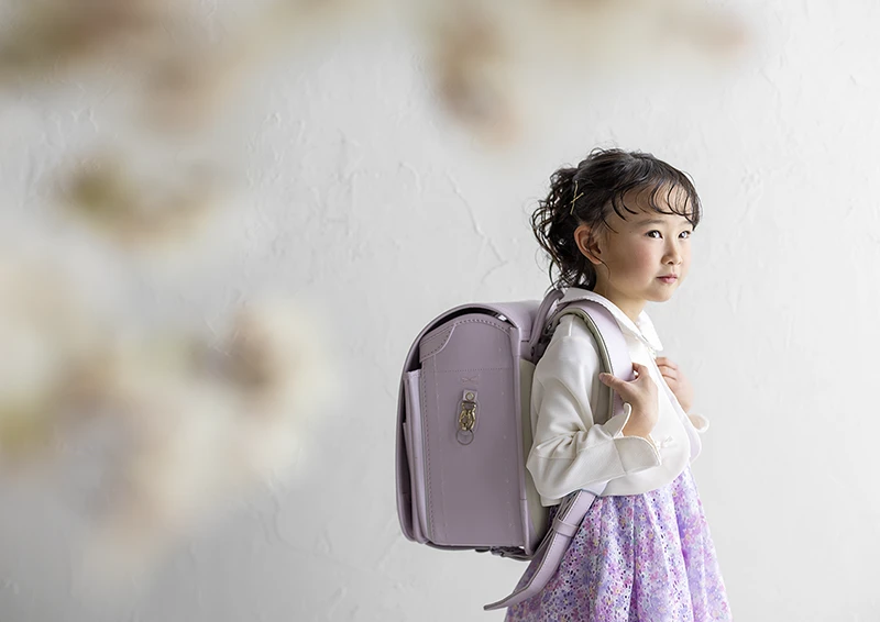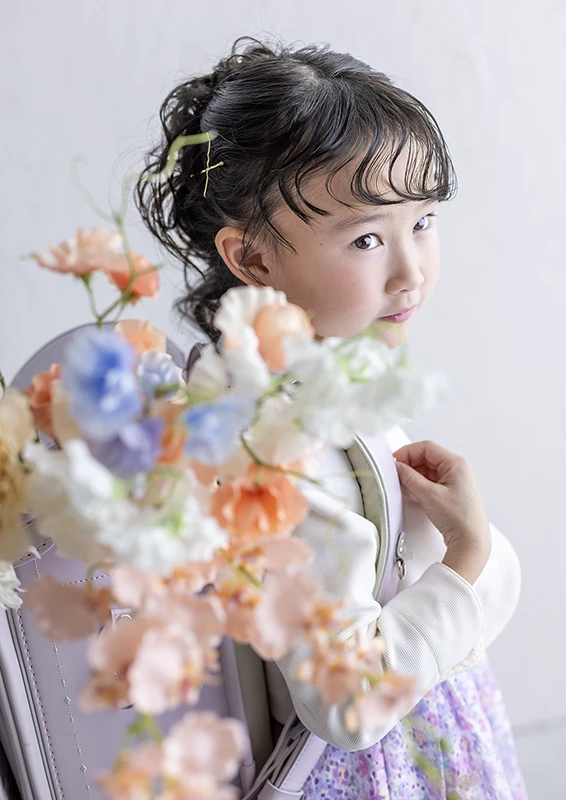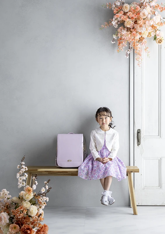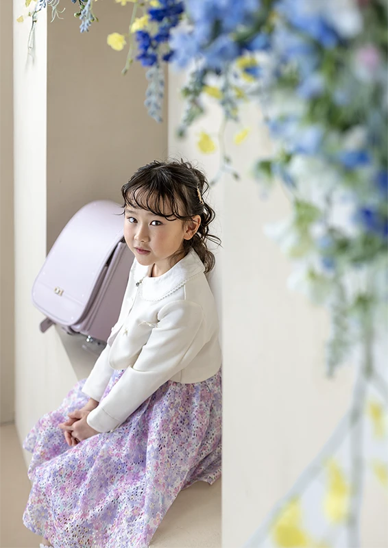 今回のモデルは女の子。パープルのランドセルに、花柄のワンピースを合わせたコーディネートで、春らしくやさしい雰囲気の入学写真に仕上がっています。ランドセルの色味と衣装のトーンが自然に馴染み、「小学校に上がる今この瞬間らしさ」がしっかり伝わる撮影になりました。