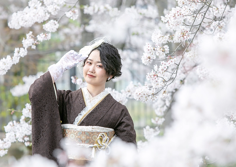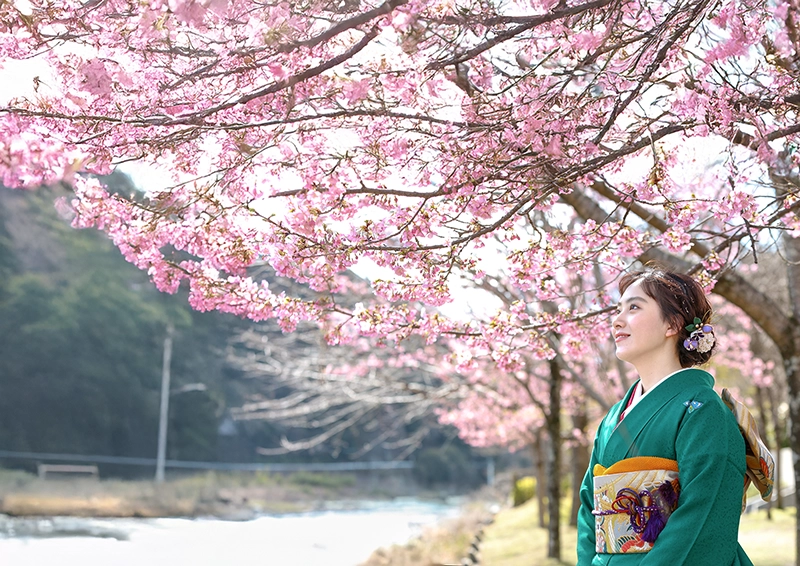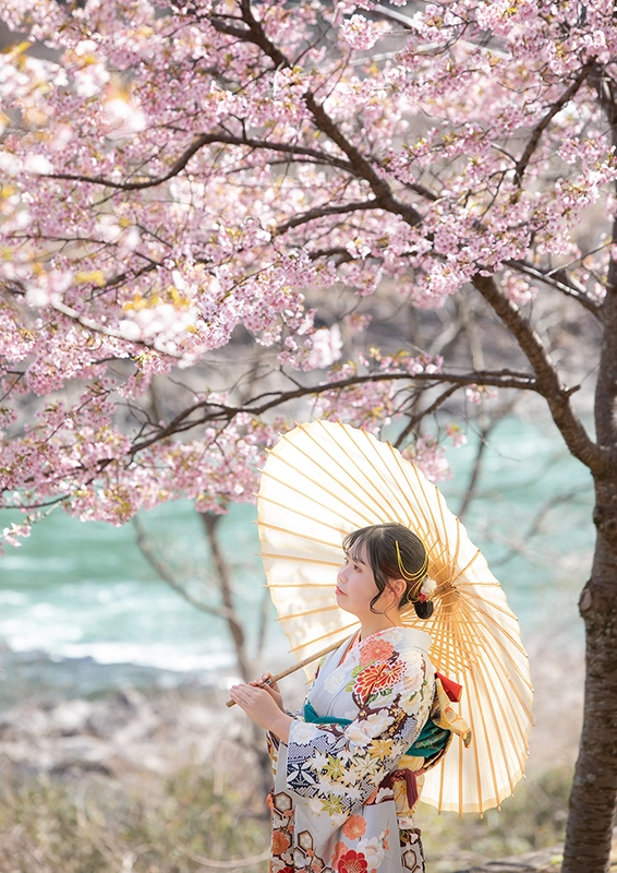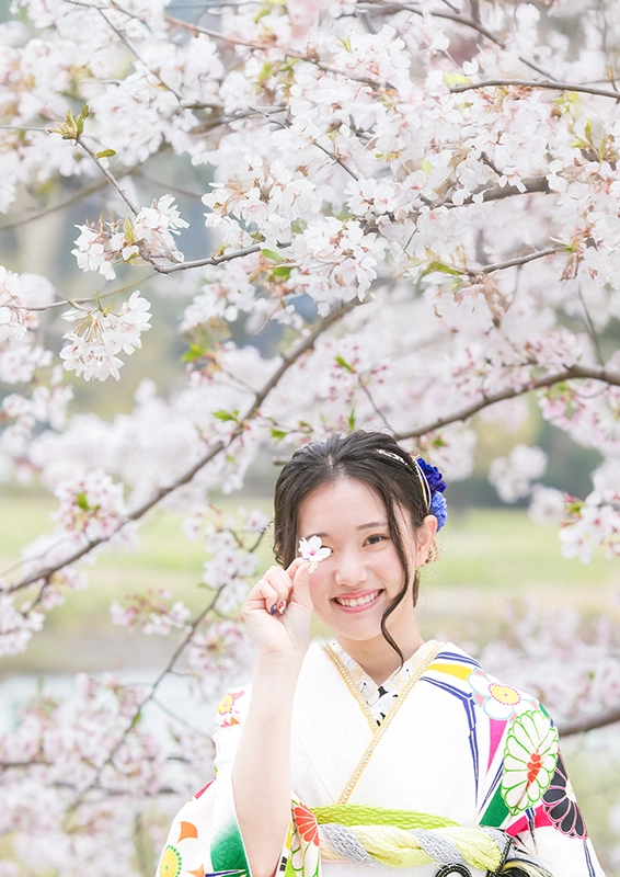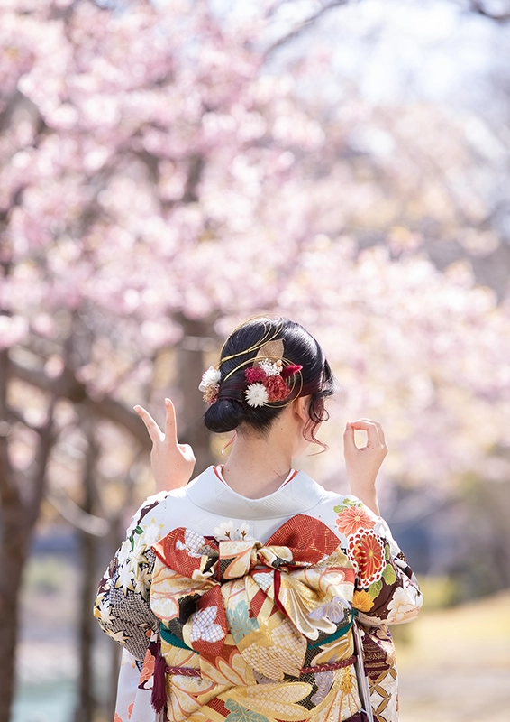 成人式の前撮りを桜の季節に行うことで、振袖の色彩と春の景色が美しく調和します。河津桜の早春のやさしい色味から、ソメイヨシノの王道の満開カットまで、時期に応じた表情の違う写真が残せます。