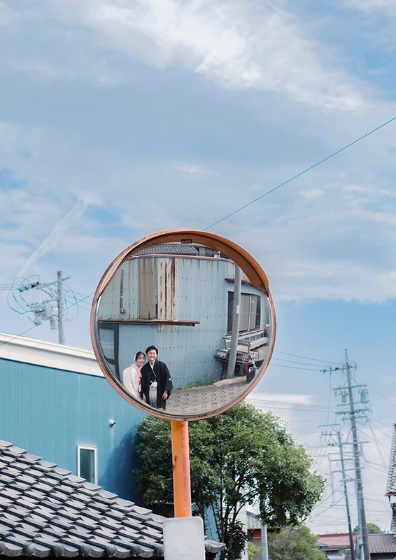 知多市岡田に残る、古い町並みと路地の佇まい。歴史と暮らしの風景が穏やかに溶け合う空間で、和装にもなじむ自然体のウェディングフォトを残します。