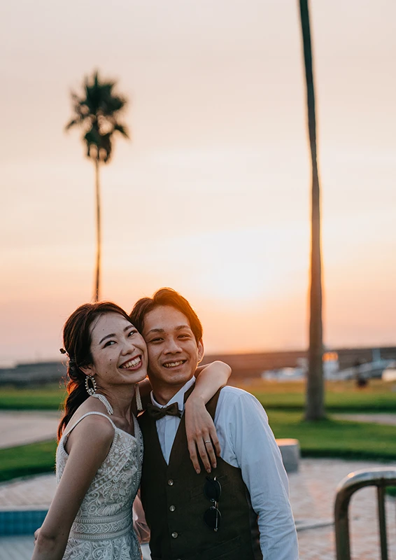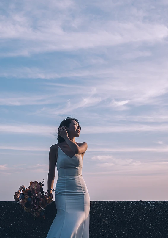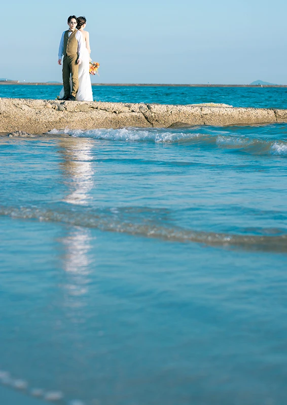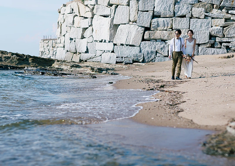 海と空が大きくひらける野間灯台の海辺は、日常から少し離れた特別なロケーション。波音と潮風に包まれながら、その瞬間、その景色の中で、ふたりらしい自然な表情を写真に残します。決められた背景ではなく、移ろう光と空気の中で撮るウェディングフォトを。