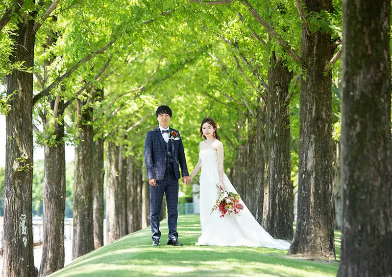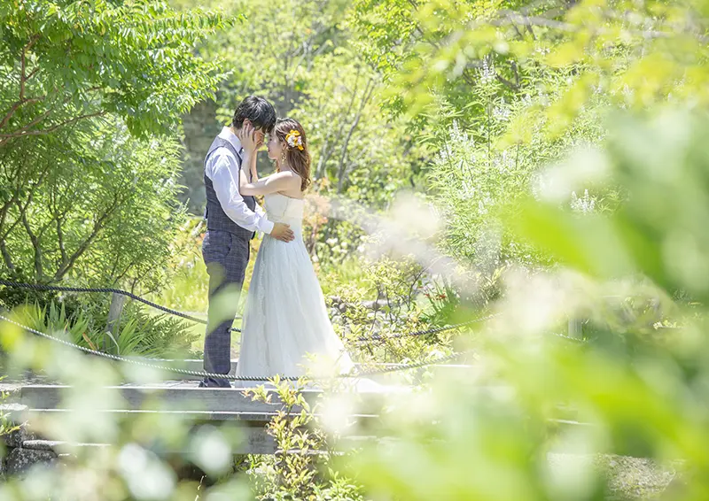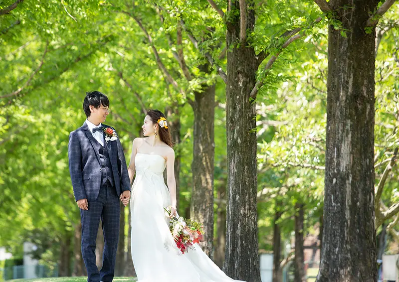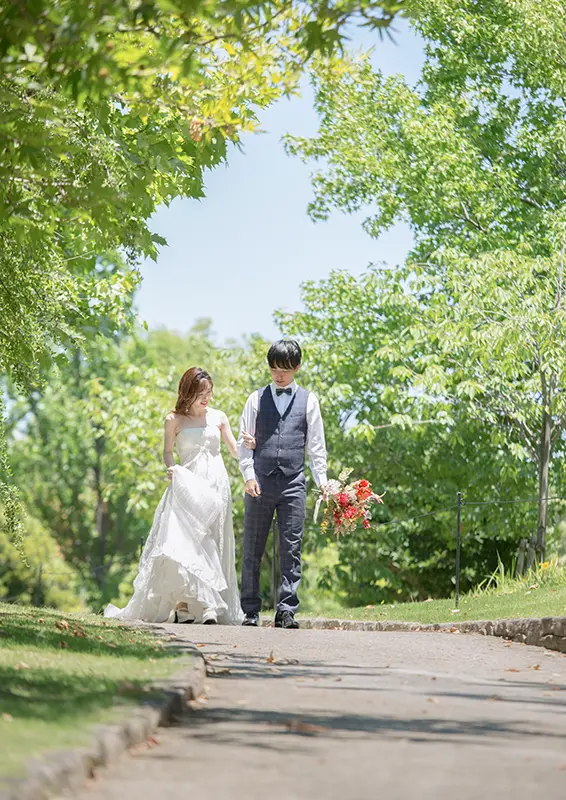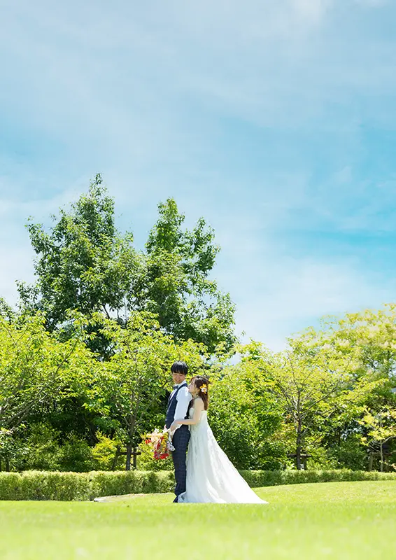 安城市にあるデンパークにて出張ロケーション撮影を承ります。季節ごとの花々を楽しめる園内で、開放感たっぷりにウェディングフォトを楽しみましょう。