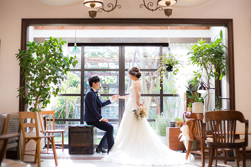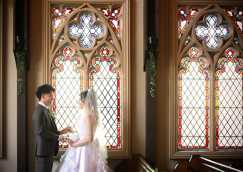 創寫舘大府スタジオに隣接する結婚式場「マキシマニス」を利用したロケーション撮影が利用可能。一般的な写真館とは違うバリエーション豊かな仕上がりに。