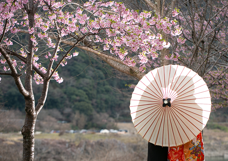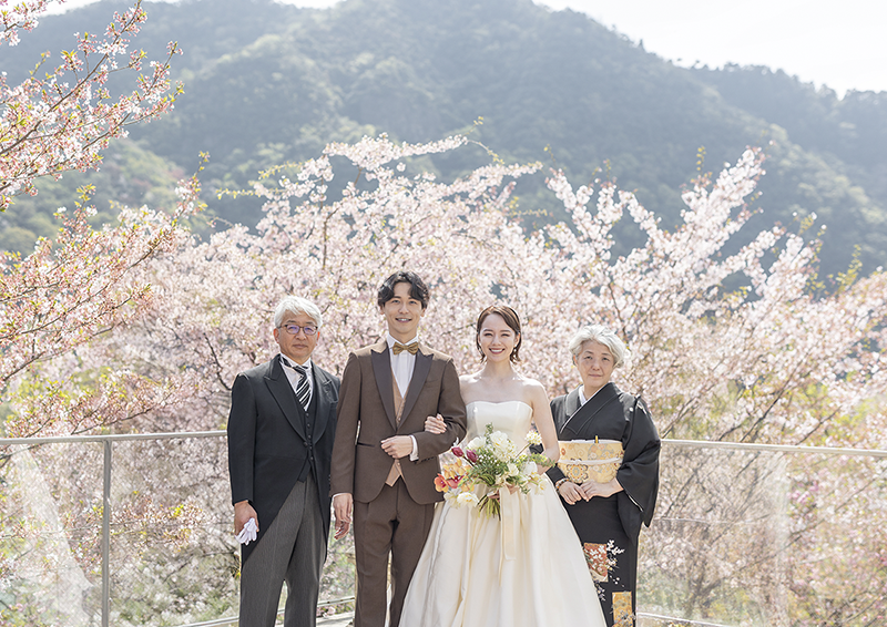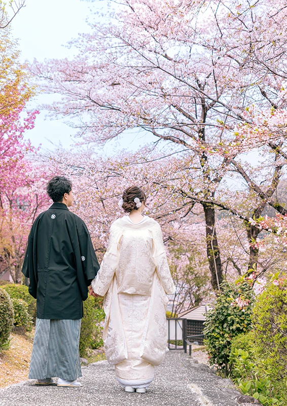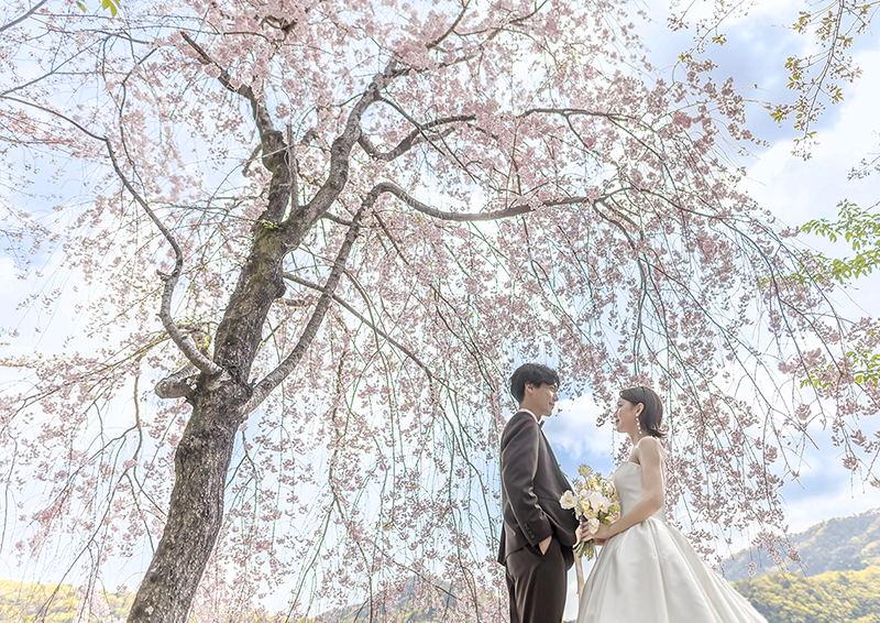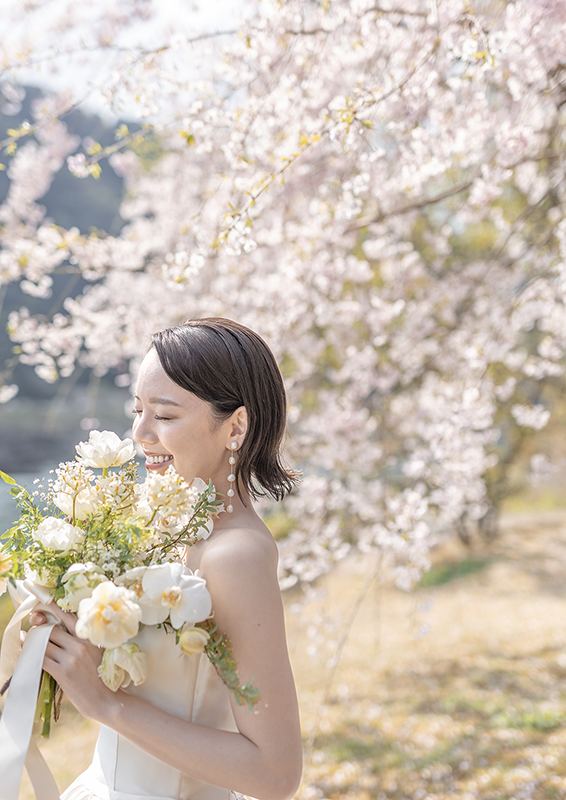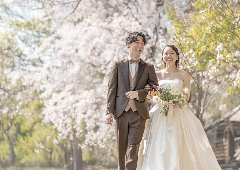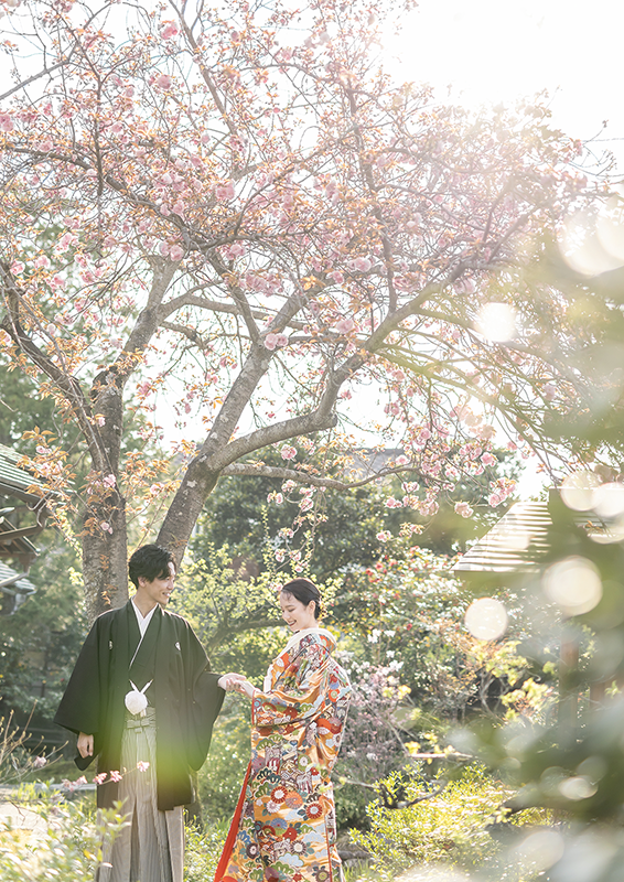 敷地内のプライベートエリアで撮影。花見客や他のウェディングフォト業者と場所を取り合うことなく、ふたりのペースでゆっくりと撮影でき、自然な表情やカットのバリエーションが広がります。